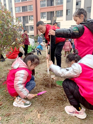 揮鍬鏟土、培土圍堰、提水澆灌……參加勞動的志愿者與孩子們種下棵棵樹苗,播灑片片綠意,忙得不亦樂乎,植樹現(xiàn)場一片繁忙景象。