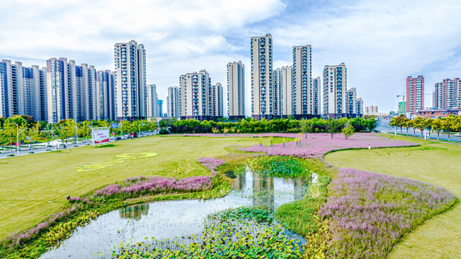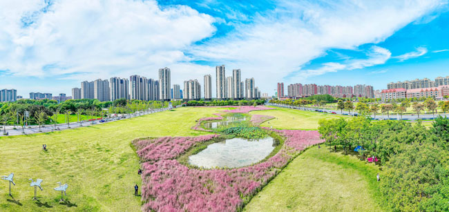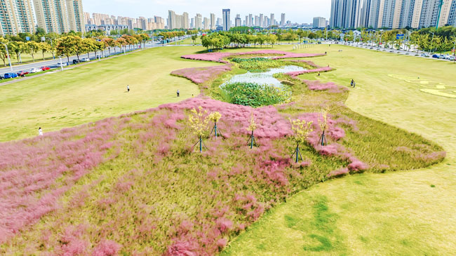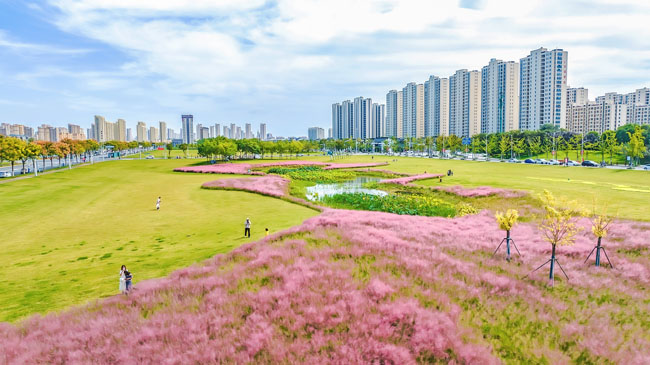 2023年10月1日,蘇宿工業(yè)園區(qū)蘇州公園北側(cè)綠地的粉黛亂子草盛開了,一片片粉色花海如夢似幻,吸引游人前來觀賞,樂享國慶假期。