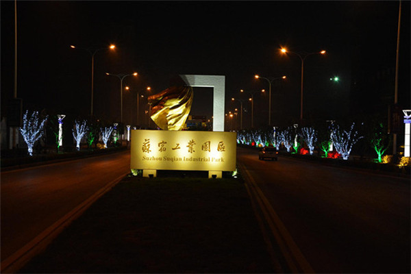 在園區(qū)東入口為民河的一畔,一座座生動(dòng)的城市剪影燈光造型在青海湖西路兩側(cè)一字排開。有象征著新加坡元素的“魚尾獅”,有蘇州工業(yè)園區(qū)金雞湖畔的東方之門、摩天輪和李公堤,還有西楚霸王項(xiàng)羽騎馬的颯爽英姿。造型以蘇州、宿遷和新加坡城市建筑輪廓線、城市主題雕塑為基本元素,以剪影形式為載體,以現(xiàn)代高科技LED燈光為表現(xiàn)手段,通過炫麗動(dòng)感的光影效果,在夜色中描繪出了一副靚麗多姿的畫卷,生動(dòng)地展現(xiàn)出了園區(qū)“從新加坡到蘇州再到宿遷”和“在宿遷、為宿遷”的發(fā)展理念。
