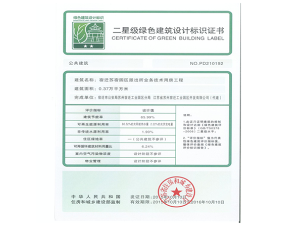 近日,由開發(fā)公司代建的蘇宿園區(qū)派出所業(yè)務技術用房工程,順利通過國家二星級綠色建筑設計標識認證。