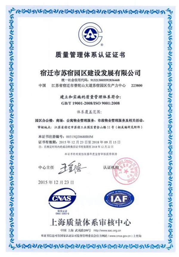 近期,園區(qū)建發(fā)公司正式獲得由上海質量認證中心頒發(fā)的ISO9001質量管理體系認證證書。